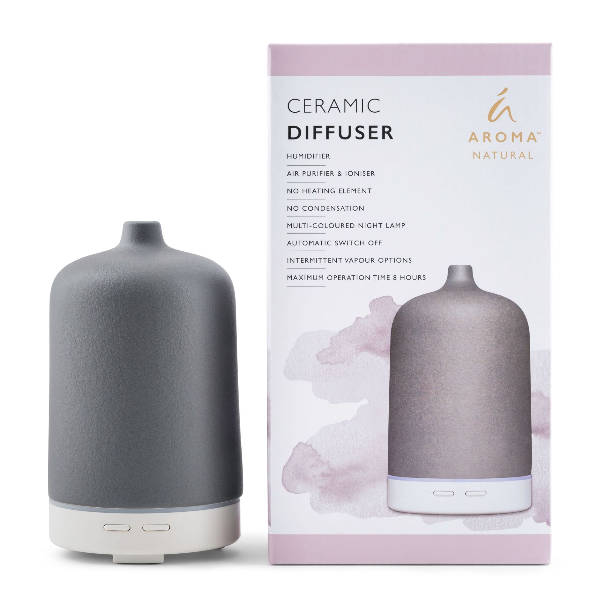 Description The Aroma Natural range of Ultrasonic Diffusers and TGA-approved, GST-free Ultrasonic Vaporisers can be used independently or with pure essential oils for therapeutic benefit. With no heating element, these multifunctional units air-purify, ionise and humidify without creating condensation, dispersing essential oils in their purest form and automatically switching off when the water depletes. - Humidifier - Air Purifier & Ioniser - No Heating Element - No Condensation - Multi-Coloured Night Lamp - Automatic Switch Off - Intermittent Vapour Options - Maximum Operation Time 8 Hours